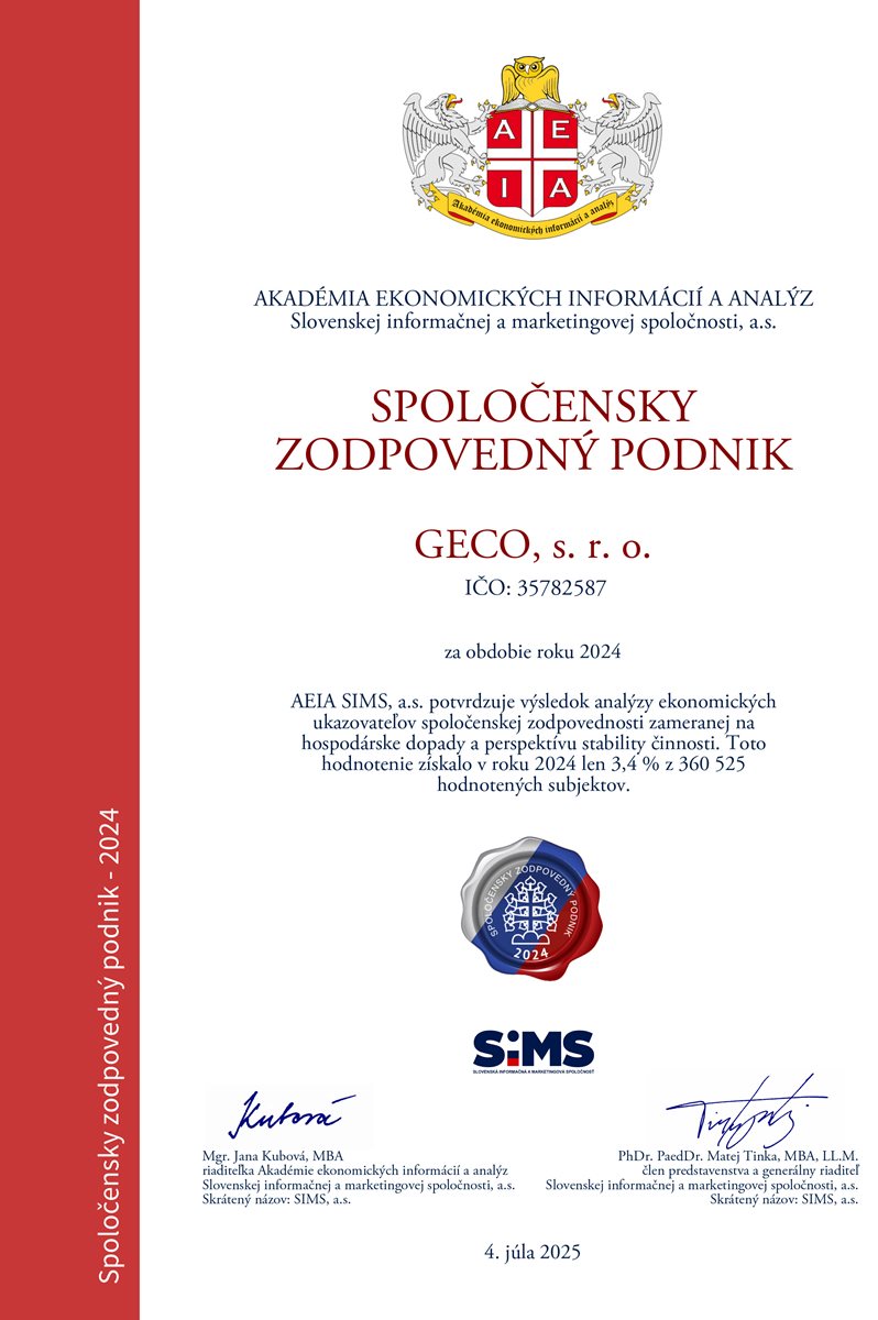 GECO, s.r.o. získalo certifikát Spoločensky zodpovedný podnik za rok 2024. Tento certifikát je udelený iba tým firmám, ktoré z celkového počtu 360 525 aktívnych slovenských podnikov naplnilo ekonomické a hospodárske aspekty spoločensky zodpovedného podnikania. V roku 2024 získalo tento certifikát len 3,4% podnikov.